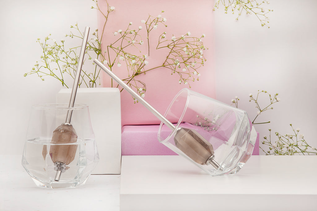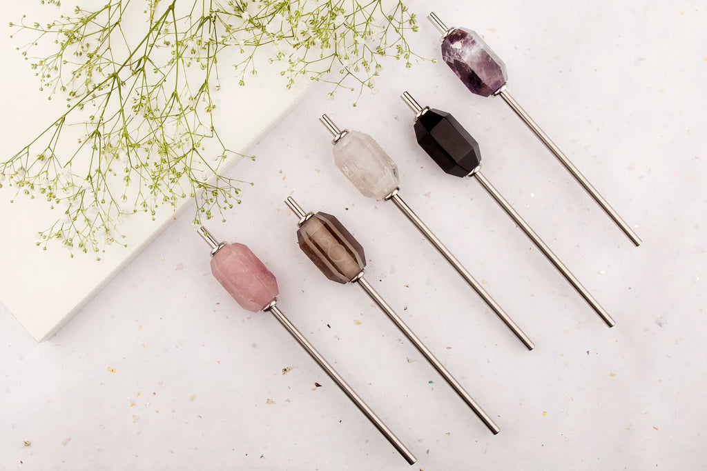 The Smoky Quartz Crystal Straw embodies grounding elegance. Known for its detoxifying energy and ability to repel negativity, smoky quartz turns hydration into a ritual of renewal. With a structured crystal and sustainable design, this piece represents balance, strength, and understated luxury for the modern wellness enthusiast.